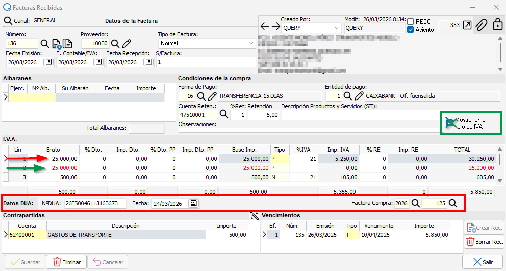 En la línea en negativo hay que desmarcar el check de 'Mostrar en libro de Facturas'