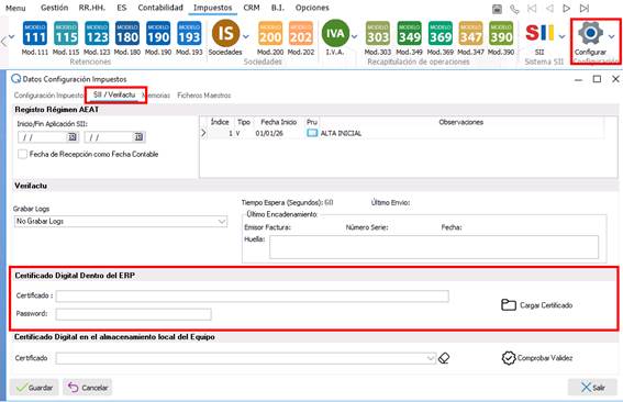 Desde el menú de Impuestos -> Configurar -> SII/Verifactu, tenemos la opción para cargar el certificado y poner la contraseña.