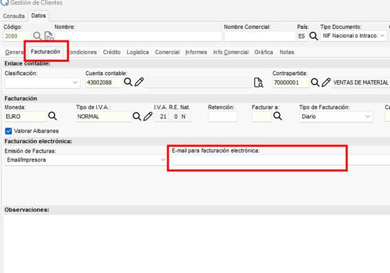 Para aquellas facturas que ya se habían generado pero en la ficha de cliente no se había indicado la dirección de correo, se puede añadir en la propia factura en la pestaña 'Factura-E'.
