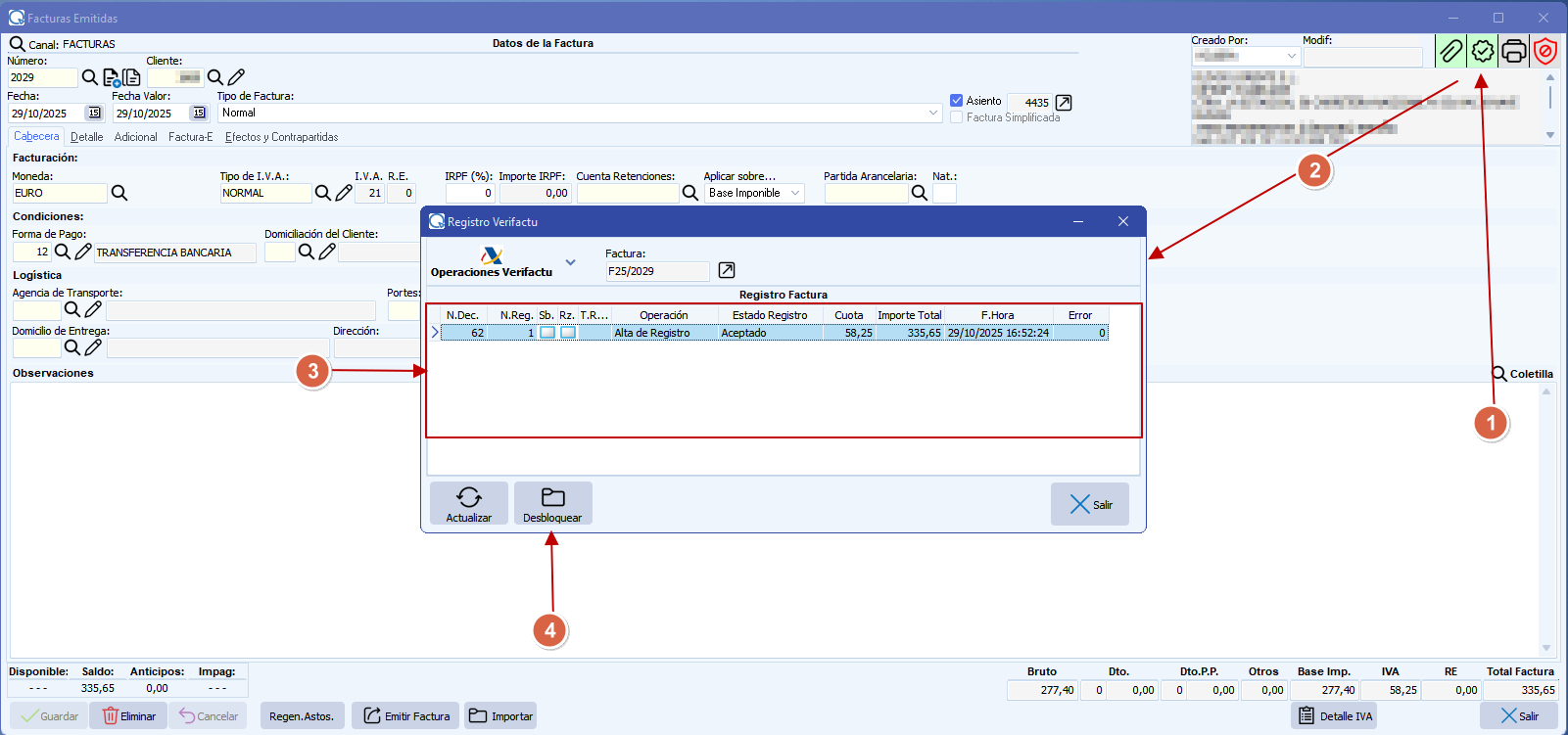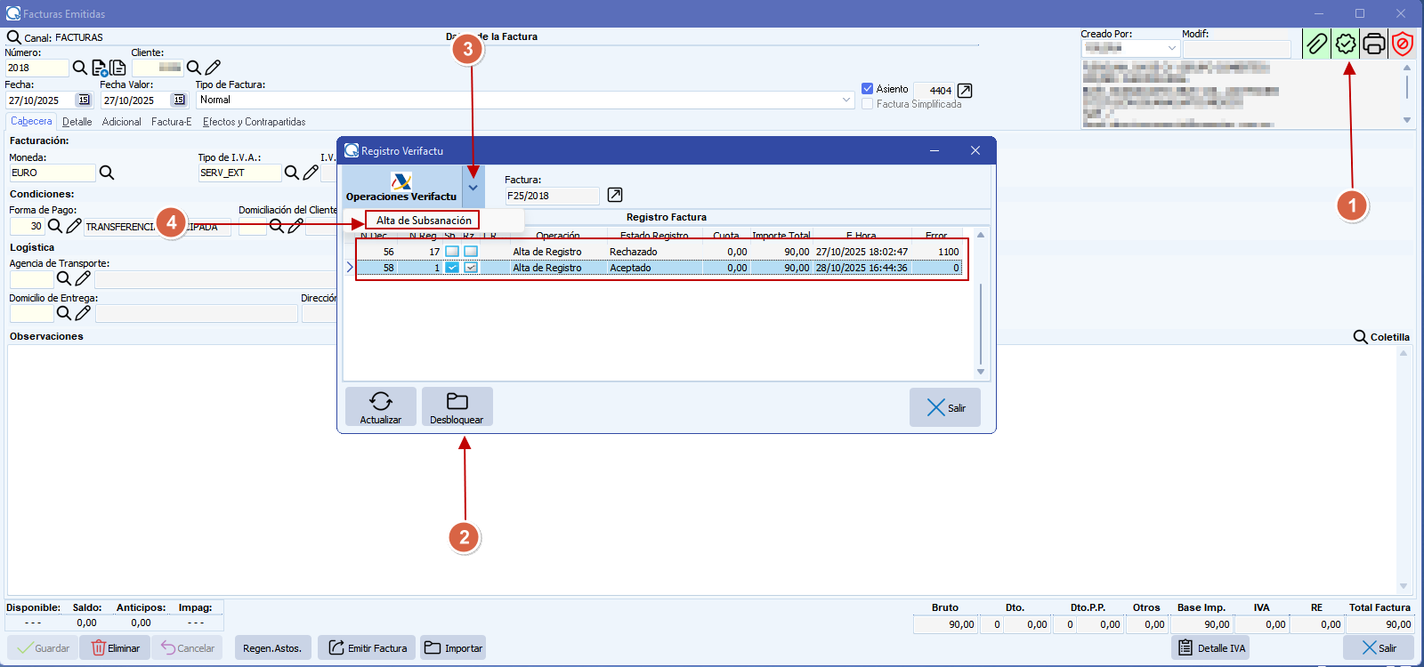 2.- Desbloqueo de la factura. Si no realizamos esta opción no podremos emitir un registro de subsanación ni modificar la factura.