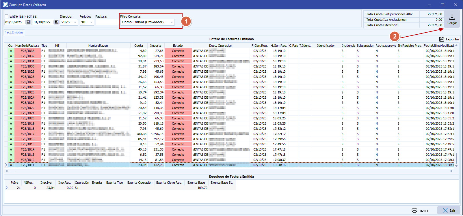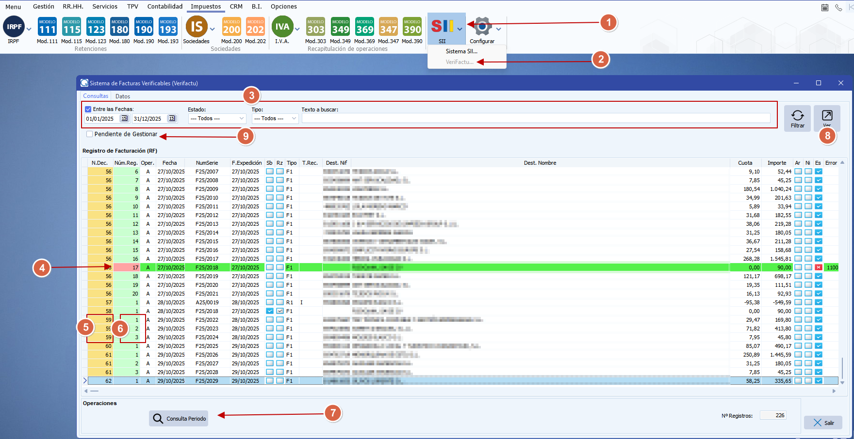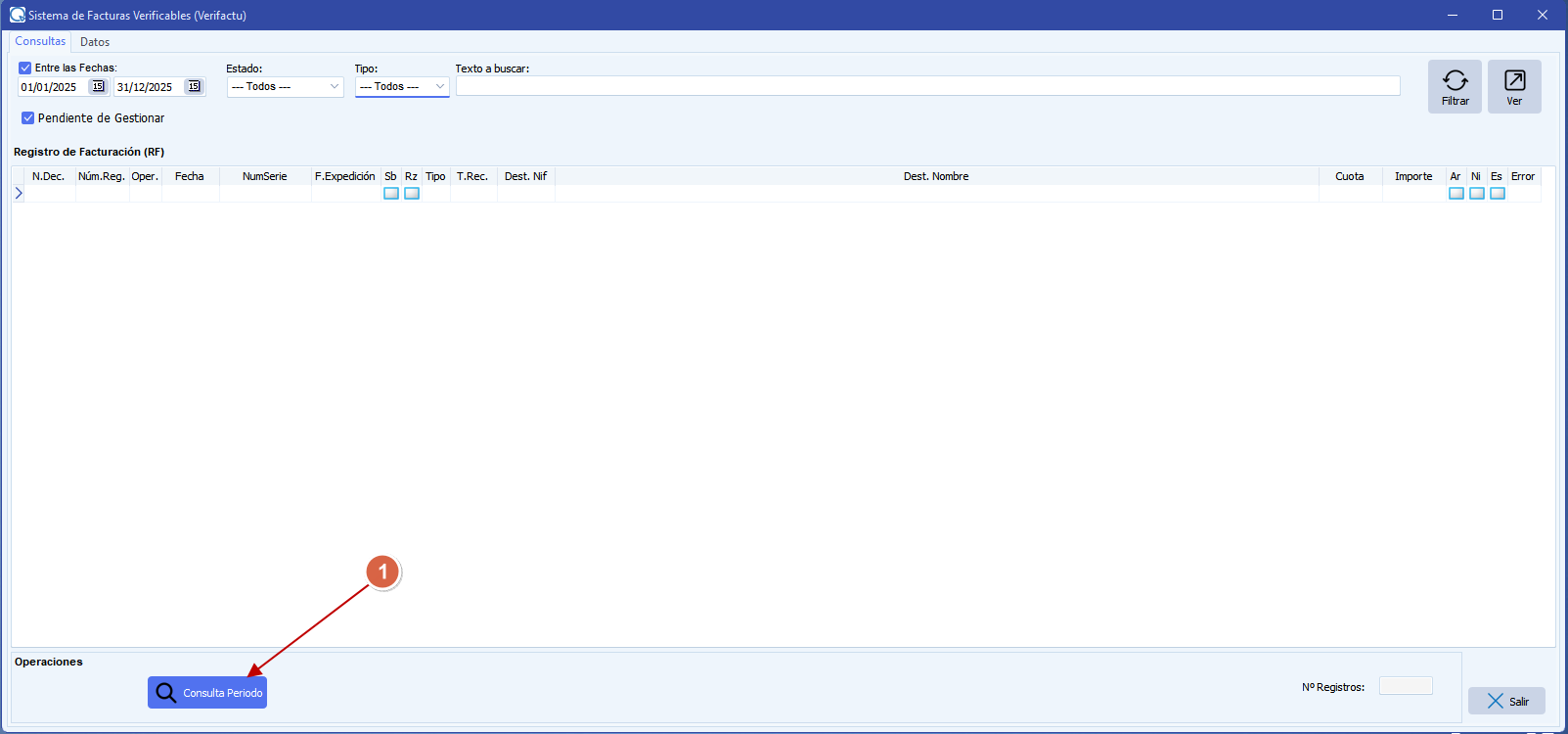 7.- Consulta Periodo. En esta opción podemos consultar los datos que la Agencia Tributaria tiene del Emisor, es decir, las facturas que ha emitido en Verifactu además de las facturas que sus proveedores/acreedores les han emitido.