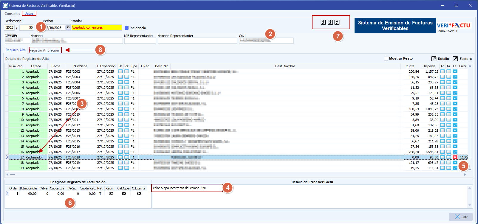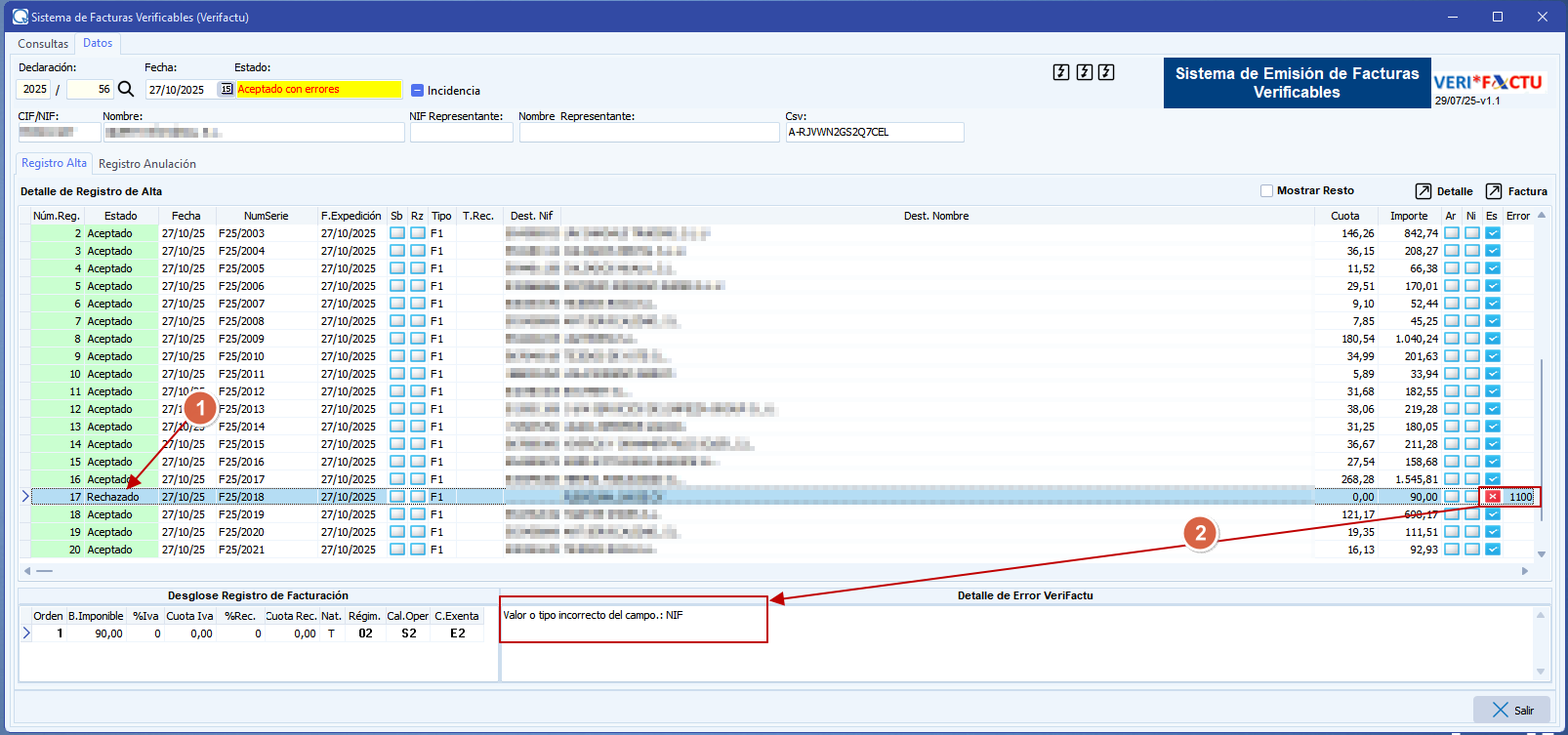 1.- Número de Declaración, Fecha y el estado que ha devuelto la declaración, en este ejemplo "Aceptada con errores", es decir, ha habido algún registro con errores. Como podemos apreciar en la línea 17 hay un registro con un problema a subsanar.